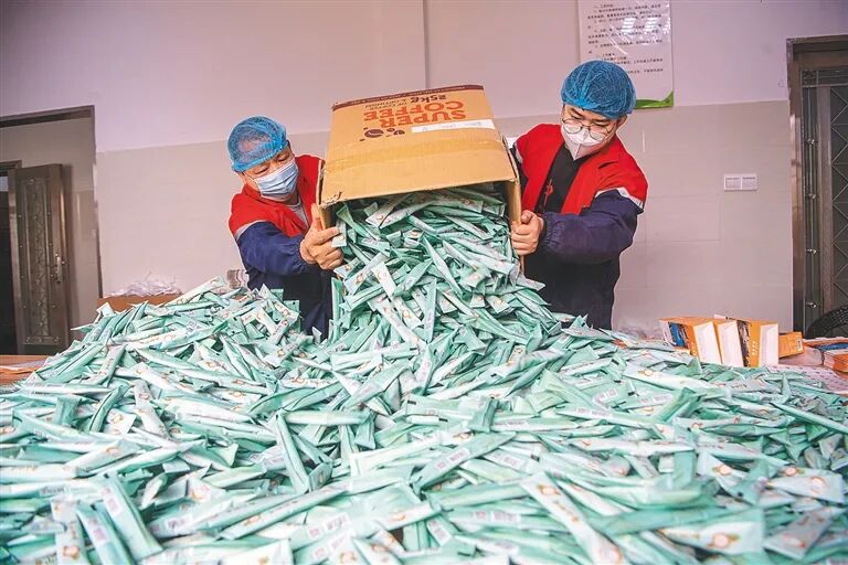 在工廠門口,一輛貨車才裝完車,正準(zhǔn)備將剛生產(chǎn)的2萬多盒咖啡運(yùn)往三亞的景區(qū)。車間里,周忠海和同事們又在為剛接到的新訂單忙碌著。