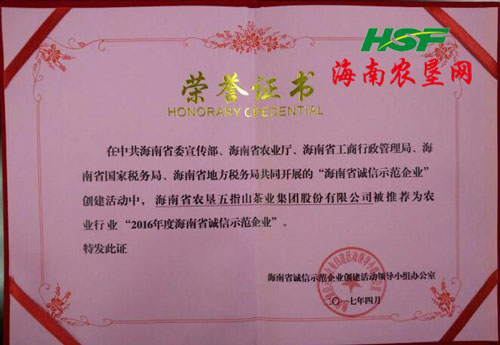 海南農(nóng)墾網(wǎng)5月22日訊 近日,海墾茶業(yè)集團(tuán)在中共海南省委宣傳部、海南省農(nóng)業(yè)廳、海南省工商行政管理局、海南省國(guó)家稅務(wù)局、海南省地方稅務(wù)局共同開(kāi)展的“海南省誠(chéng)信示范企業(yè)”創(chuàng)建活動(dòng)中,被推薦為農(nóng)業(yè)行業(yè)“2016年度海南省誠(chéng)信示范企業(yè)”。(陸和)