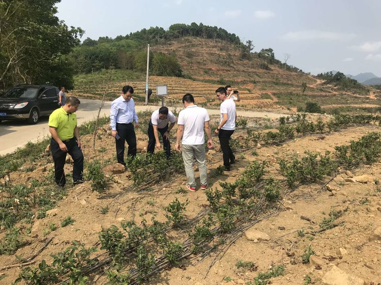 圖為:張士康(右二)主任,王盈峰工程師在總裁吳海江等陪同下,在瓊中物流園區(qū)海墾茶業(yè)生態(tài)科技園項目基地實地察看地形。