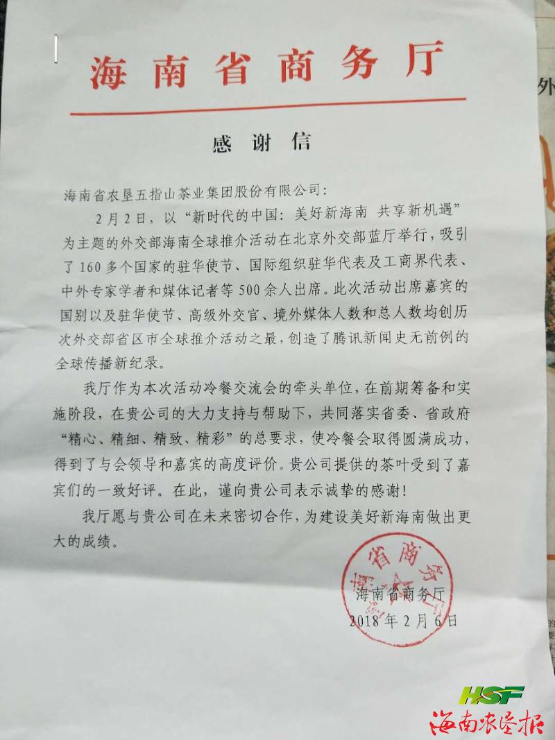 海墾茶業(yè)集團收到海南省商務(wù)廳感謝信
